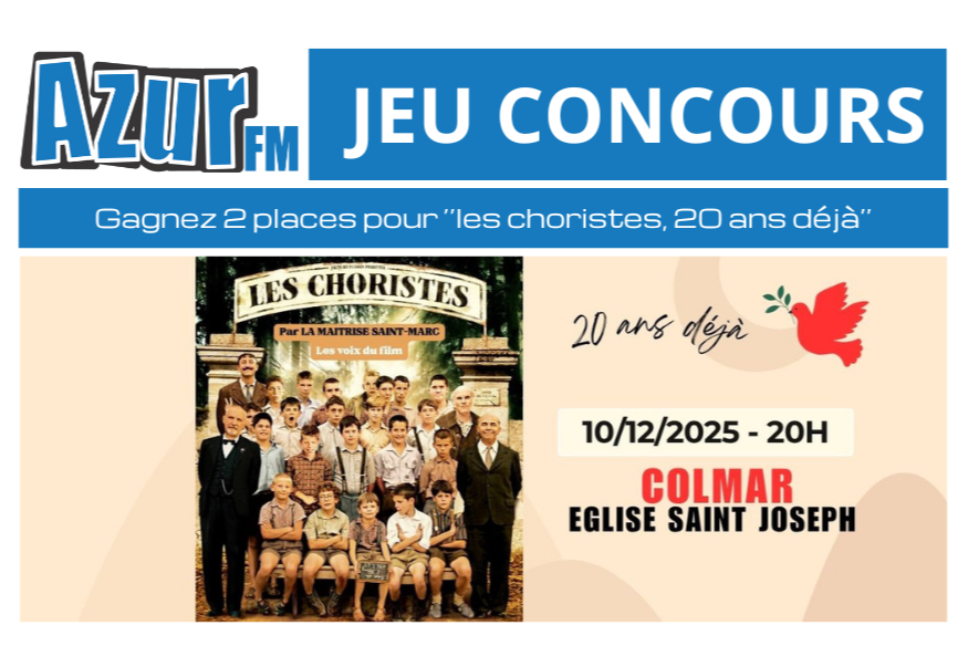 Du 27 octobre au 02 novembre, gagnez 2 places pour le concert de la Maîtrise Saint-Marc qui célèbre les 20 ans du film culte ‘’Les Choristes’’ le mercredi 10 décembre à 20h à l'église Saint-Joseph à Colmar. Ce spectacle réveillera la magie du film grâce aux belles voix d'enfants et à une direction artistique fidèle à son esprit. Venez vivre 20 ans d'émotion ! Les jeunes choristes interpréteront des airs emblématiques comme "Vois sur ton chemin", "Caresse sur l'océan", et "Cerf-volant", ainsi que des créations inédites pour l'occasion. Avec 16 à 20 jeunes talents sur scène, les performances se tiendront dans des lieux prestigieux, allant des cathédrales aux théâtres, offrant une acoustique parfaite. Vos billets disponibles sur www.mlprods.com , Office de tourisme et Points de vente habituels.