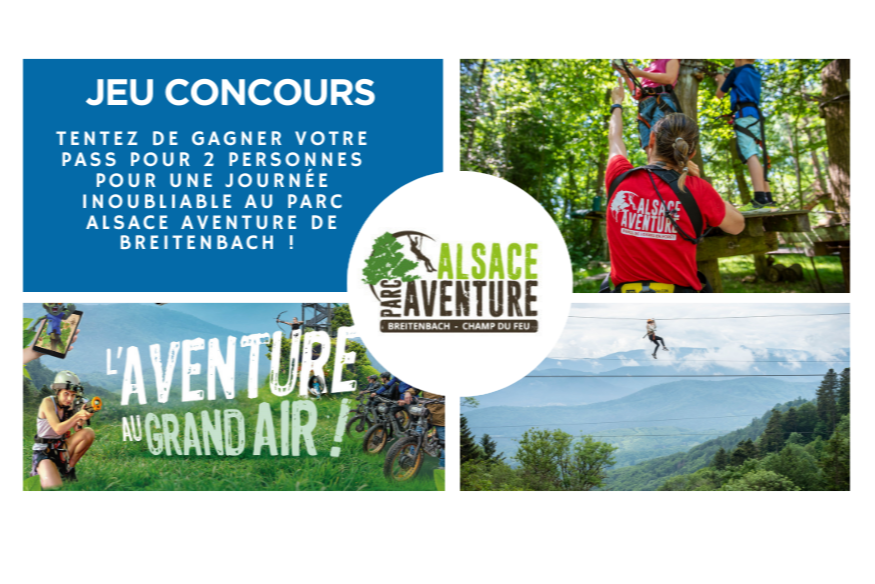 Du 4 au 10 mai, tentez de gagner 2 billets le PARC ALSACE AVENTURE, votre parc de loisirs en forêt au cœur du massif du Champ du feu à 45 minutes de Strasbourg et/ou de Colmar. Accrobranche, tyroliennes géantes et plus de 15 activités insolites à découvrir sur alsace-aventure.com