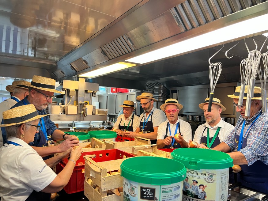 130 kilos d'oignons, de la patience et quelques larmes... Jeudi 13 novembre, les membres de la confrérie des Zewwelatreppler se sont attelés à une session d'épluchage d'oignons en vue de la préparation de leur fameux velouté. Pour cela, le rendez-vous était donné dans l'après-midi au sein du restaurant Au pied de bœuf, dont le chef détient les secrets de cette recette « unique ». « Ce soir c'est épluchage d'oignons, sous la direction de notre Grand Maître – Denis Digel, ndlr – et des membres du comité, avec les larmes qui coulent, mais ça fait partie du job », explique David, membre des Zewwelatreppler. Face aux larmes provoquées par certains composés présents dans les oignons, quelques astuces ont été trouvées. « J'ai mis des lunettes de plongée », confie David. La hotte a également été allumée afin d’éviter au maximum les désagréments. Il s'agissait ici de la deuxième fois que les membres de la confrérie se regroupaient à l'occasion de cette tâche. Auparavant, l'épluchage des oignons était réalisé à plus faible échelle, en comité restreint.