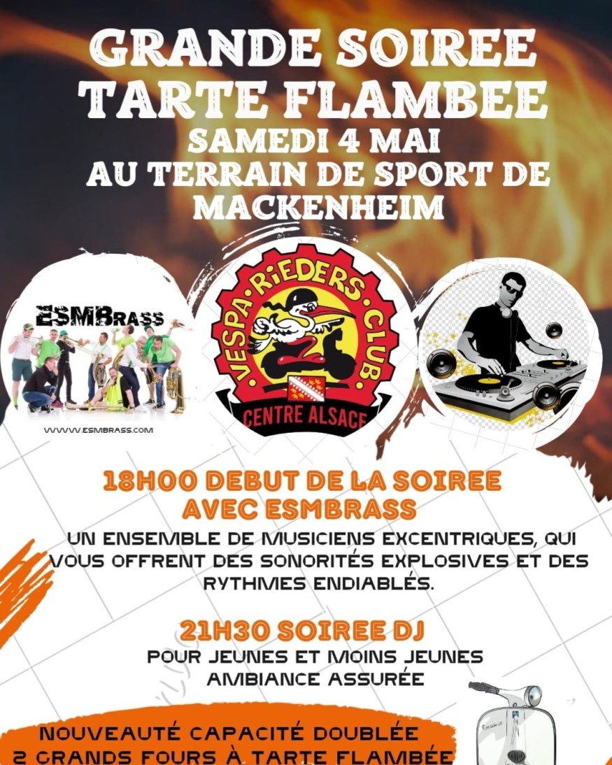 Le Vespa Rieders Club vous invite ce samedi 4 mai à la troisième édition de leur grande soirée tartes flambées. Le club propose déjà des animations en journée, notamment avec des balades en vespa. L'occasion de passer un moment convivial dans les alentours du village et de profiter d'un pique-nique. La soirée débutera ensuite à partir de 18h. Tartes flambées mais aussi petits pains au chorizo et baguettes à l'ail vous seront proposés. L'ensemble de la soirée sera animée par de la musique, notamment avec le groupe ESMBrass pour des compositions de cuivre et de percussions. A partir de 21h30, un DJ prendra le relais. Pascal Weissenbach, président du club, nous apporte plus de précisions concernant cette soirée.