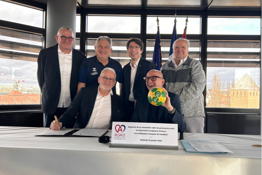 Ce début d’année 2025 marquera un nouveau tournant dans la politique sportive de la Collectivité européenne d’Alsace (CeA). Alors que l’équipe de France de handball était en préparation pour le championnat du monde, qui débute ce mardi 14 janvier, le Président de la Fédération Française de Handball (FFHB), Philippe Bana, s’est rendu à l’Hôtel d’Alsace dans le but de signer une convention entre les deux instances. L’objectif est simple, renforcer le lien entre l’Alsace et le handball, troisième sport pratiquer par les alsaciens après le football et le tennis, tout en renforçant l’attractivité du territoire à travers le sport.