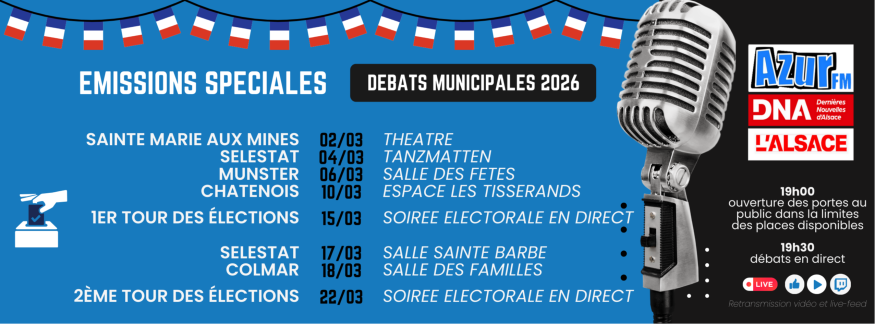A l'occasion des élections municipales de mars 2026, Azur FM, les DNA et l'Alsace vous proposent de découvrir vos candidats durant des débats publics à :
