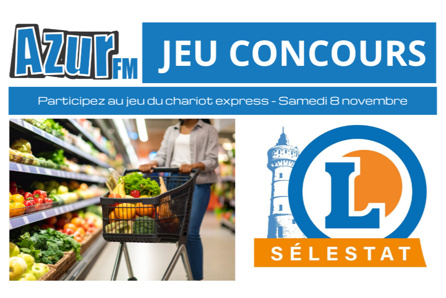 Azur FM fête ses 30 ans, ce samedi 8 novembre ! Inscrivez-vous pour participer au jeu du ‘’chariot express’’, organisé ce samedi 8 novembre au centre Leclerc en zi nord à Sélestat, à 10h et à 11h (2 sessions de jeu). Remplissez un chariot en 1 minute et gagnez vos courses de la semaine !