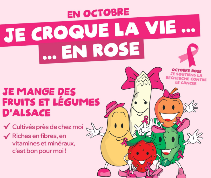 Croquez la vie en rose avec les Fruits et Légumes d’Alsace ! En ce mois d’octobre, phare dans le cadre de la lutte contre le cancer du sein, l’interprofession décide à son tour d’agir face à la maladie, par le biais d’un partenariat avec l’Institut de cancérologie Strasbourg Europe (INCANS). Opérations de communication et boites à dons seront à retrouver tout au long du mois chez de nombreux membres de l’interprofession des Fruits et Légumes d’Alsace : producteurs, magasins, coopératives, grossistes, restaurants collectifs, …